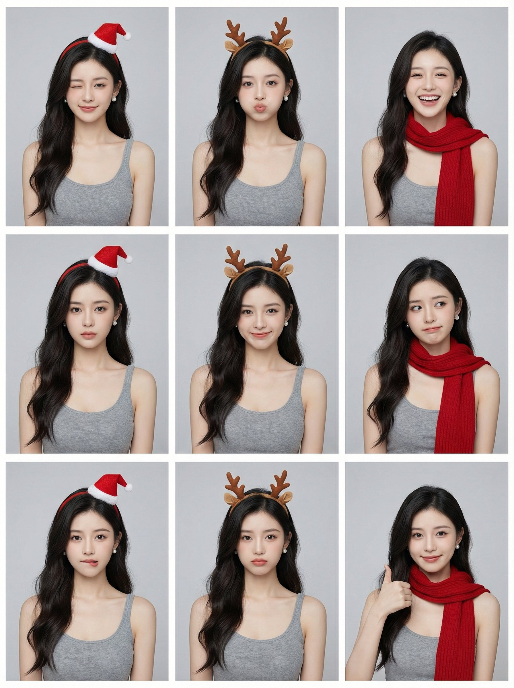 { "project_settings": { "task_type": "9-Grid Minimalist Portrait", "aspect_ratio": "3:4", "batch_size": 1 }, "theme_config": { "style": "Minimalist Christmas Accents", "intensity": "Subtle / Accessory only", "logic": "Keep original clean aesthetic, add only ONE festive accessory per panel" }, "prompt_payload": { "structure": "A single contact sheet image containing a 3x3 photo grid matrix", "subject_base": { "identity": "Young Asian woman (Face ID)", "outfit": "Simple grey knit tank top or white t-shirt (Clean, modern look)", "makeup": "Natural, clean, fresh" }, "festive_accents": { "option_1": "Wearing a small, cute red mini Santa hat", "option_2": "Wearing subtle brown reindeer antler headband", "option_3": "Wearing a simple red knitted scarf loosely" }, "visual_style": { "background": "Solid light grey or white studio background (No busy Christmas trees)", "lighting": "Soft studio photography light, clean shadows", "color_palette": "Grey, White, Skin tone, with a pop of Red" }, "expression_flow": "9 distinct playful expressions (Winking, Pouting, Laughing, Serious, etc.)" } }