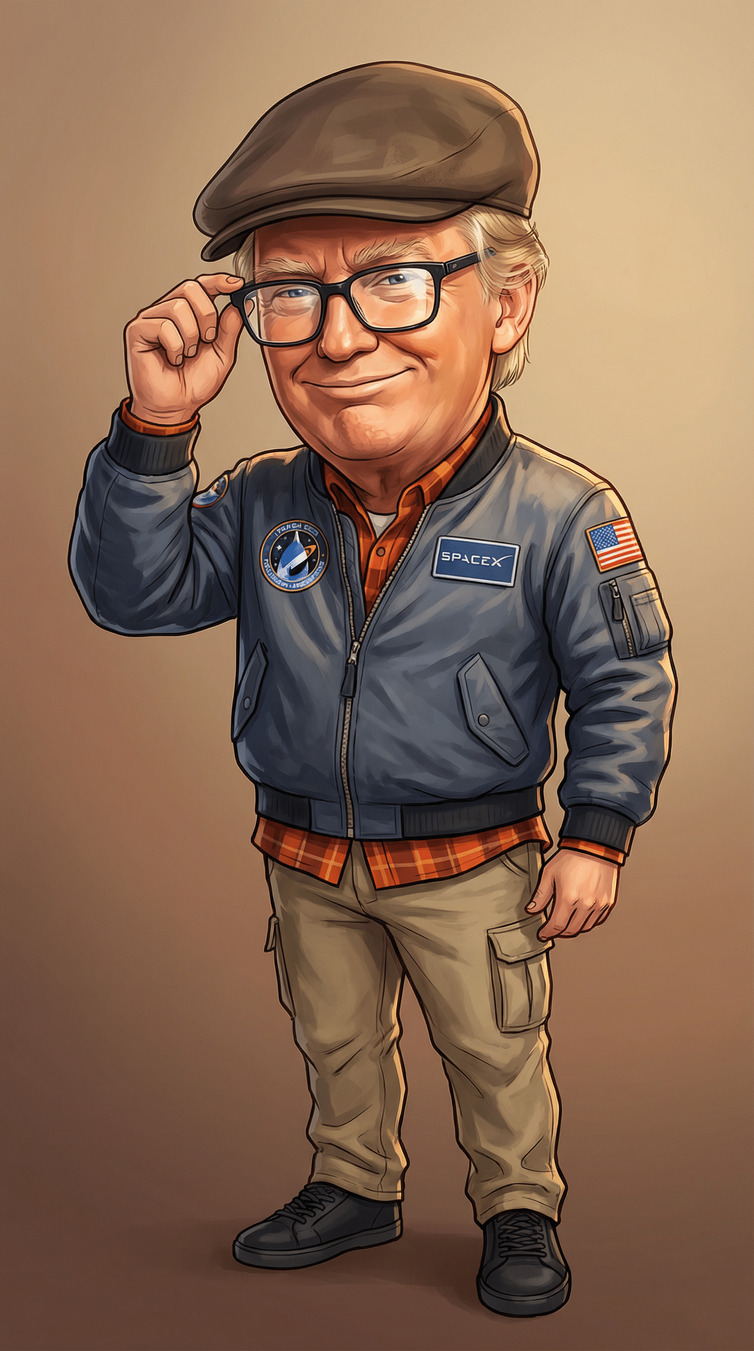 Create a realistic digital caricature painting of firgure 1 with a slightly oversized head, exuding charm and quiet confidence. He is dressed in space x. Underneath, he wears a warm-toned flannel shirt slightly visible at the collar and cuffs, paired with khaki cargo pants and black sneakersthat ground the outfit with a casual yet confident energy. Completing his look, he wears a brown flat cap tilted slightly forward — a small detail that adds personality and flair.The man is portrayed in a mid - shot,adjusting his glasses with one handwhile gazing directly at the viewer with a self - assured and composed expression.His head is slightly larger than normal,emphasizing his thoughtful character and giving the image a light caricature charm without losing realism.The facial expression radiates intelligence,humor,and approachability.The lighting is warm and soft,like that of a late afternoon sun filtering through a studio setup.Smooth gradual shadows enhance the contours of his face,while subtle highlights accentuate the texture of his bomber jacket and the reflection in his glasses.His skin tones glow naturally under the warm light,creating a pleasant sense of depth and realism.The background is a gradient of warm brown and beige hues,blending smoothly from light to dark.This background is simple yet elegant,allowing the subject to stand out while maintaining a professional,editorial quality.The art style should combine semi - realistic digital painting with the texture of oil brushstrokes,delivering a balanced fusion of realism and stylized charm.Clean outlines,smooth blending,and controlled highlights give the impression of a modern portrait illustration— detailed,expressive,and visually captivating.