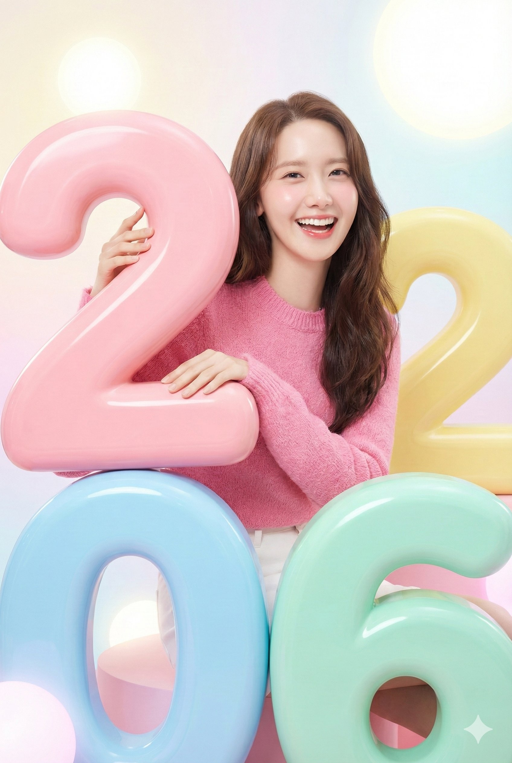 { "type": "image_prompt", "style": "ultra-bright cute advertising studio poster", "subject": { "identity": "cheerful playful Thai young woman", "expression": "smiling and laughing", "pose": "sitting happily on a glossy pastel 3D number while leaning playfully against another", "hair": { "length": "long", "texture": "soft wavy", "quality": "natural bounce" }, "makeup": { "style": "fresh dewy", "cheeks": "rosy", "lips": "glossy" } }, "outfit": { "top_layer": "soft pink oversized shirt", "inner_top": "white tank top", "bottom": "light blue jeans", "style": "pastel casual" }, "props": { "year_reference": "2026", "numbers": { "highlighted_digit": { "number": "2", "description": "first digit of 2026, significantly larger than the others", "style": "oversized rounded pastel 3D" }, "supporting_digit": { "number": "0", "style": "glossy pastel 3D", "interaction": "subject sitting on it" }, "other_digits": ["2", "6"] } }, "environment": { "setting": "studio", "lighting": "high-key studio lighting", "glow": "soft glow", "color_palette": "candy pastel", "mood": "bubbly, joyful, cute, playful" }, "photography": { "type": "professional commercial photography", "realism": "ultra-realistic", "quality": "high-end advertising look" }, "composition": { "aspect_ratio": "5:4", "text": "none" } }
