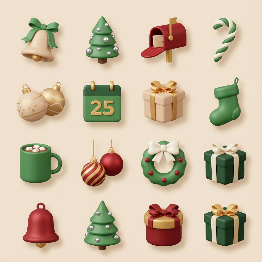 A set of elegant and modern Christmas-themed 3D icons. The overall design uses gold and red as the main colors, with all icons rendered in 3D and featuring soft matte textures and subtle shadow effects. The set contains 12 elements: a beige bell with a green bow, a simply decorated Christmas tree (adorned with silver ornaments), an American-style mailbox, a green and white striped candy cane, two beige Christmas balls, a green calendar marked "25", a light beige gift box tied with a gold ribbon, a green Christmas stocking, a green hot chocolate cup filled with marshmallows, a pair of striped and solid-color ornaments, a Christmas wreath decorated with a white bow and Christmas balls, and a dark green gift box tied with a creamy white ribbon. All icons maintain a consistent proportion and design style, featuring rounded corners and refined details, suitable for various sizes, making them ideal for modern Christmas-themed designs. This icon set is simple yet sophisticated, maintaining a festive atmosphere while showcasing high-quality design.