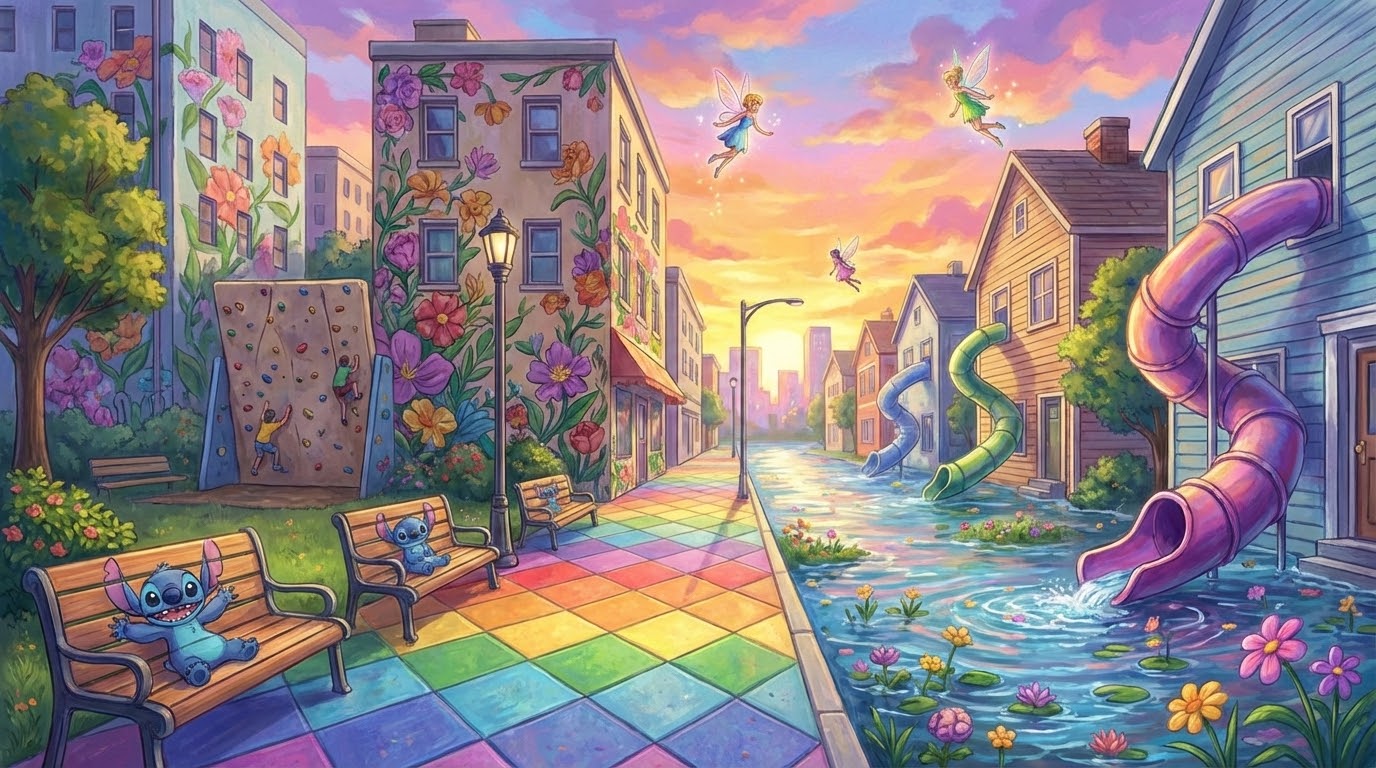צור תמונה או איור עם מדרכת יהלומים בצבע קשת.ציורים של פרחים על הבניינים. קיר טיפוס בפארק, סטיץ' מצויר על ספסלים. מגלשה לרחוב מהחלונות של הבתים, פיות מרחפות בשקיעה. כביש מלא מים ופרחים.