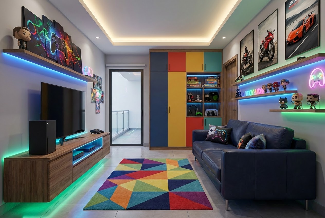 אני רוצה שתהייה יצירתי. יש לי שני בנים בוגרים בני 12, שאני רוצה לעשות להם עיצוב לחדר משחקים יפה, חדשני, מעניין שיהיה שם אקס בוקס, מסך טלוויזיה, ואקססוריז שמתאימים לחדר כזה. שיהיה צבעוני, יפה, מעניין, גברי מתאים לארח חברים מהכיתה. כל מטרת החדר הוא אך רק להנאה ומשחקים. אין צורך במיטה או שולחן כתיבה. אפשר לשים ארון או לשלב אותו בעיצוב בשביל לשים קצת חפצים שקשורים למחשב ולדברים שלהם של המחשקים ומשחקי קופסא לאחסון בארון. בחדר צריכה להיות ספה ככה בסביבות שתי מטר על 90 ואמור להיות ארון וכמו שידת טלויזיה כזאת, תאורה מתאימה, תמונות מעניינות שמתאימות (אבסטרקט) אולי של מכוניות, אולי שם רוכבי אופנועי שטח, אולי של אקס בוקס או סוני פלייסטיישן (בקיצור משהו גברי ולא ילדותי). שים לב שמידות החדר הם 3 מטרים על 3.4 מטרים. יש מצד אחד דלת כניסה של 90 ס"מ שנפתחת לתוך החדר ויש עוד דלת של יציאה למרפסת. שולחת לך את התמונה של החדר והמרפסת בכדי שיהיה לך רפרנס. אני אשמח לכמה הדמיות רלוונטיות לפי כל ההנחיות שהנחתי אותך.